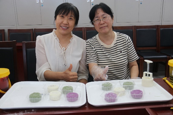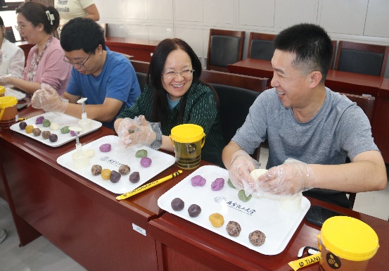随后的“巧手迎中秋——手工月饼制作”环节,成为全场欢乐焦点。老师们自由组队,围站桌前揉面团、包馅料、压花模,指尖翻飞间,一个个造型精巧的月饼逐渐成型。大家互相讨教技巧,不时因“创意馅料搭配”或“花纹不完美”发出阵阵笑声,在动手实践中沉浸式感受中秋传统文化的独特韵味,更用亲手制作的月饼,为节日与生日留下双重纪念。