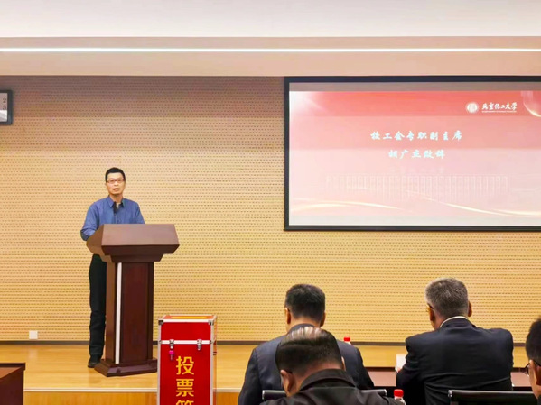 校工会专职副主席胡广杰代表校工会致辞,他肯定了校机关第四届教代会、工会委员会五年来的工作,指出校机关教代会、工会要始终以习近平新时代中国特色社会主义思想为指导,全面履行分工会职能,在暖人心、促和谐,保稳定、促发展方面发挥积极作用,并希望新一届教代会常设主席团和工会委员会能够继续增强服务意识、提升育人水平,持续发挥好作为党联系群众的桥梁和纽带作用。
