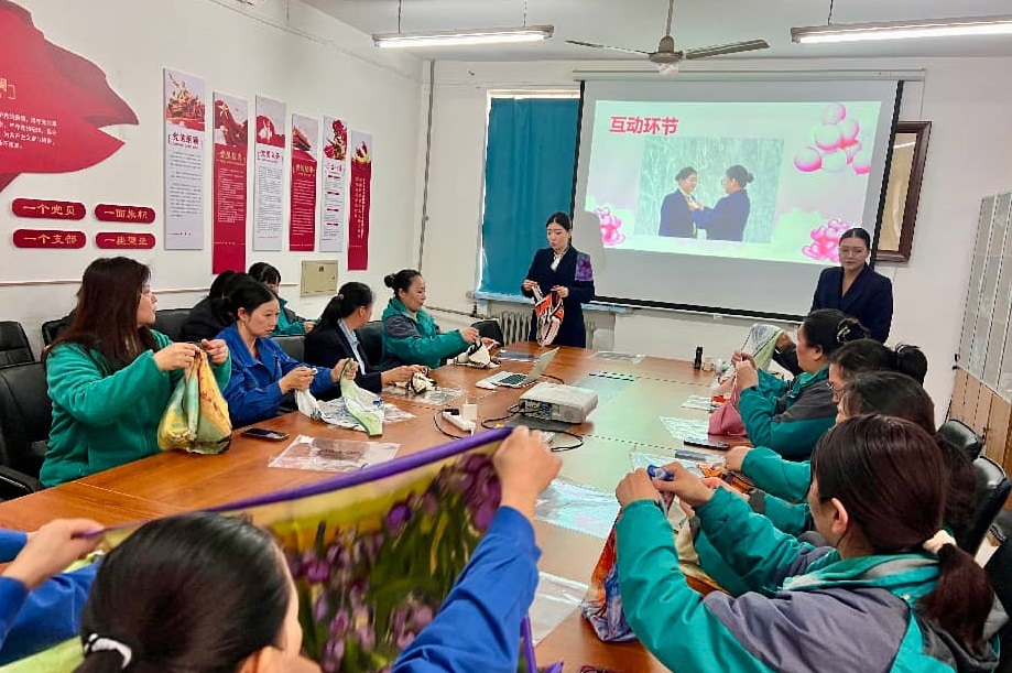 丝巾搭配环节,郑老师现场演示“钻石结”“领花结”等基础系法。女职工们热情高涨、现学现用,在讲师的指导下,用手中的丝巾变幻出多种精致造型,解锁“颈”上添花的魅力,为日常穿搭增添了精致感与灵动感。